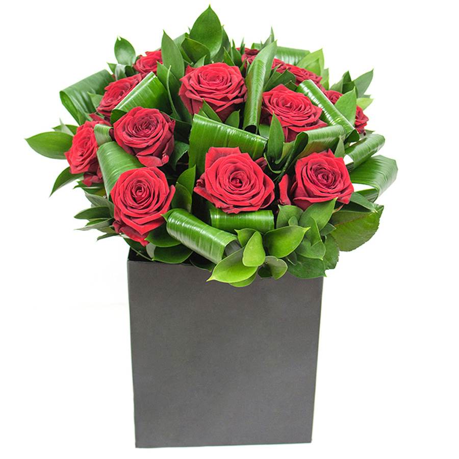 Our luxurious bouquet showcases a vibrant mix of red roses, elegant aspidistra leaves, and lush ruscus. This unique flower arrangement is designed to infuse any room with beauty and grace.